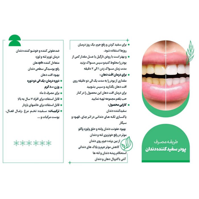 پودر سفید کننده دندان از مواد بسیار با کیفیت و گیاهی تشکیل شده است که دارای خصوصیات زیر می باشد: